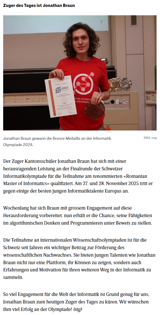 25.11.2025 Zuger des Tages Jonathan Braun, Schüler der Kantonsschule Zug https://www.zg.ch/behoerden/direktion-fur-bildung-und-kultur/ksz/dokumente/medienspiegel/zuger-des-tages https://www.zg.ch/logo.png Zuger des Tages 25.11.2025 Jonathan Braun, Schüler der Kantonsschule Zug Bild Legende: Zuger Zeitung 25.11.2025