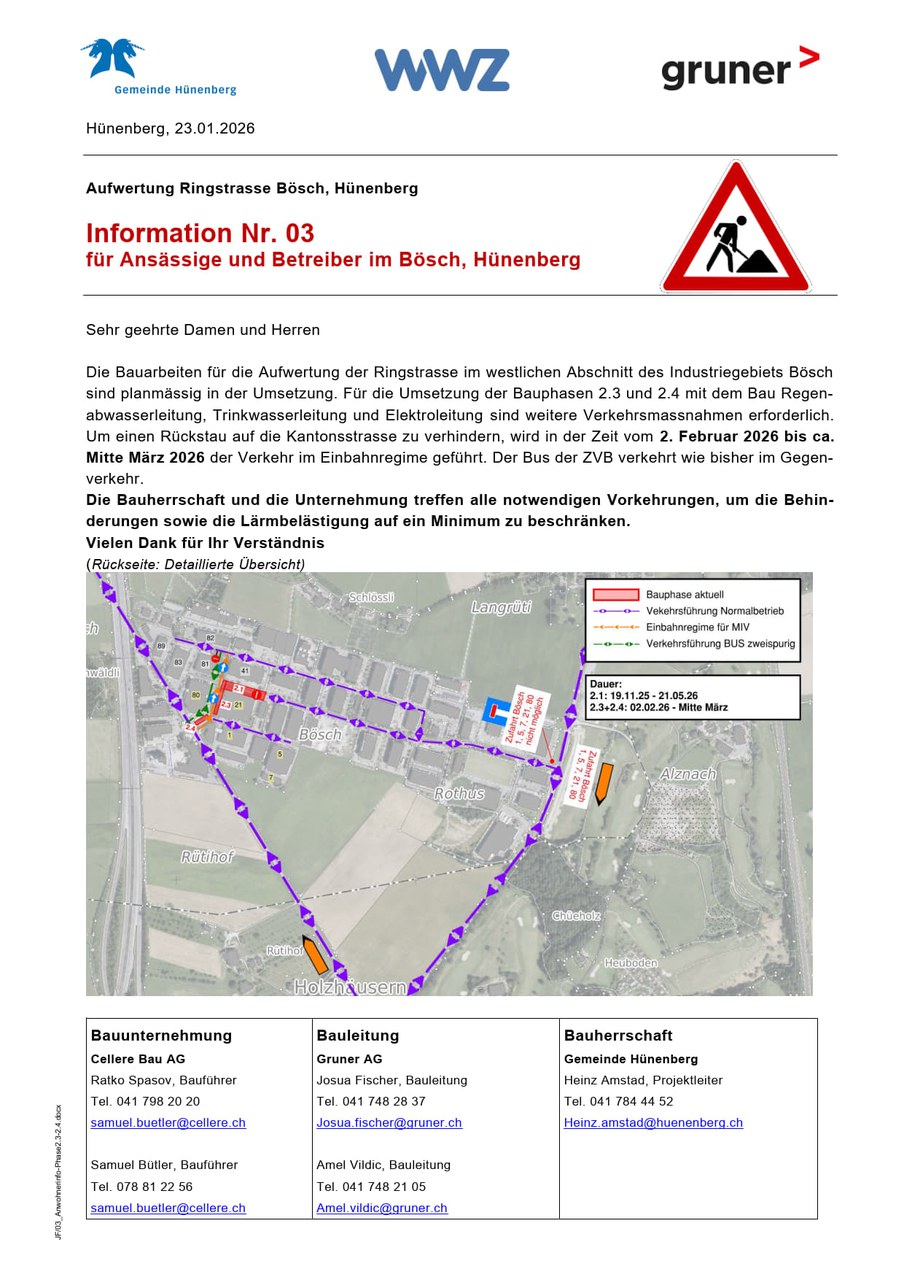 Information Nr. 03 für Ansässige und Betreiber im Bösch, Hünenberg
