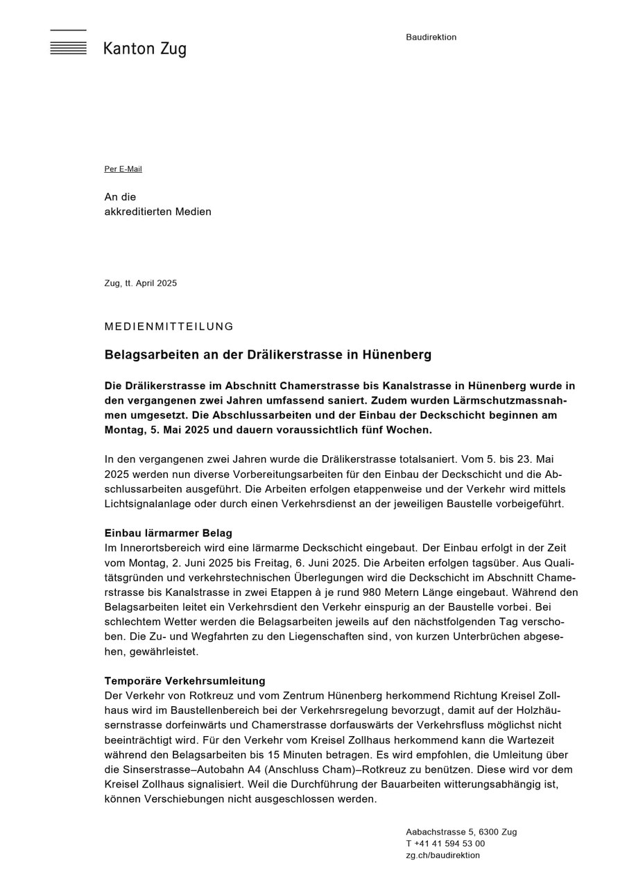 02.05.2025Belagsarbeiten an der Drälikerstrasse5. Mai 2025https://www.zg.ch/behoerden/gemeinden/hunenberg/de/verwaltung/sicherheit-und-umwelt/strassen_tiefbau/aktuelle-projekte-1/aktuell/belagsarbeiten-an-der-draelikerstrassehttps://www.zg.ch/logo.png