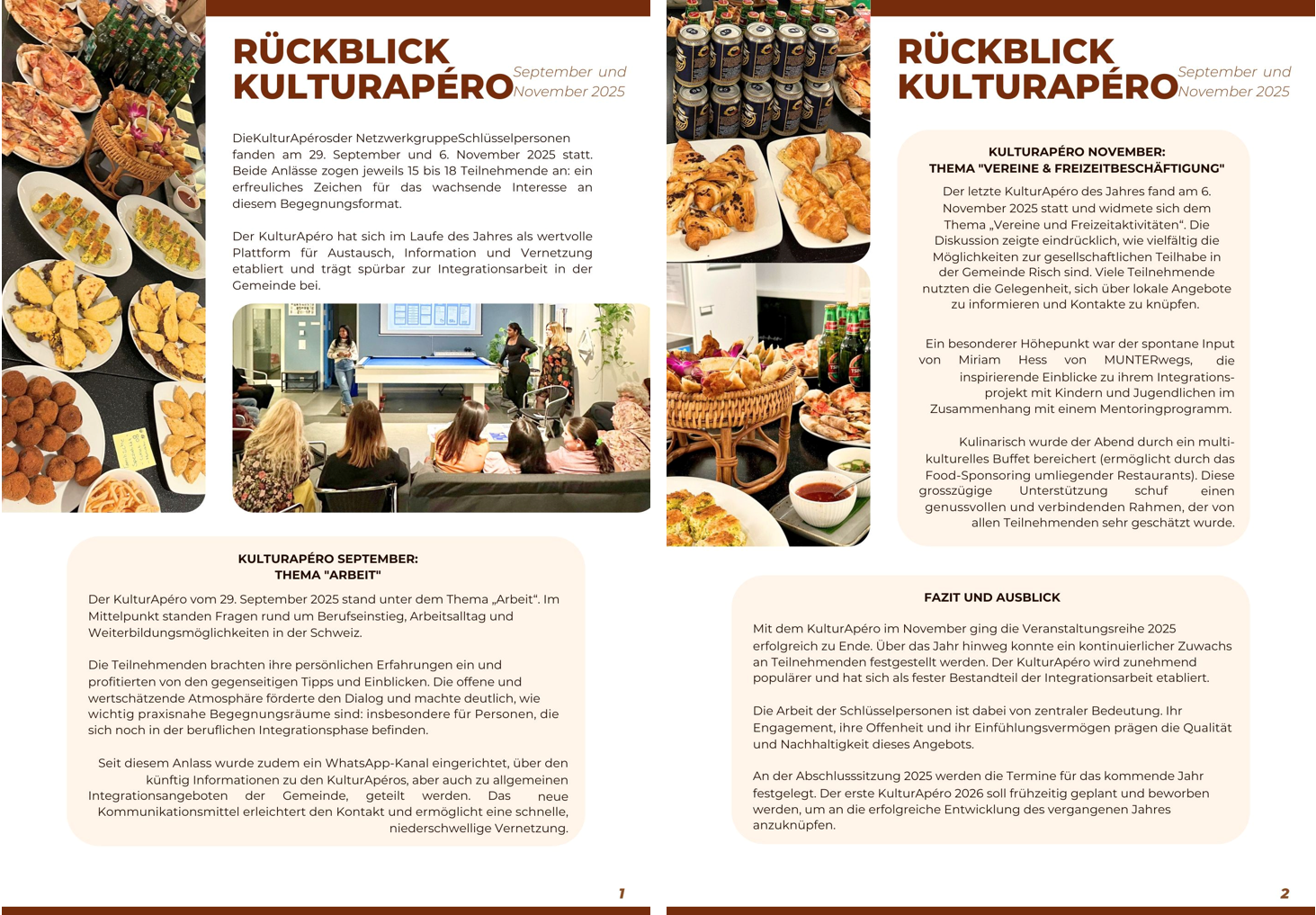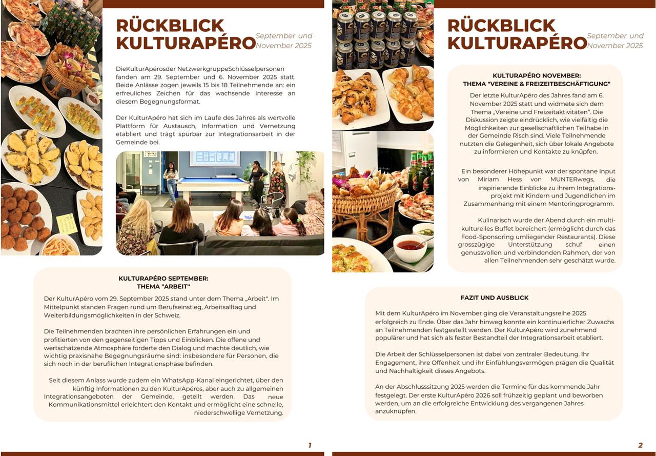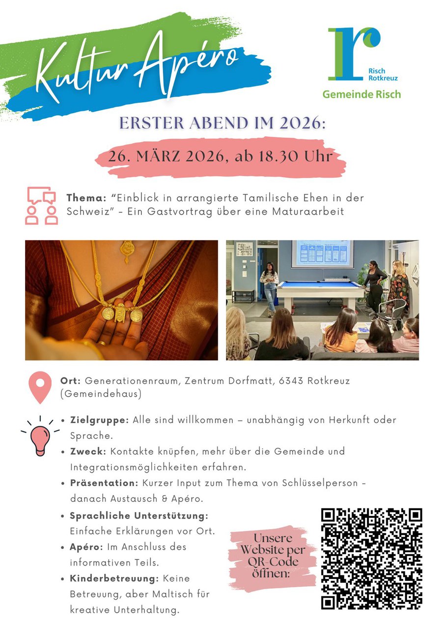 Der Kulturapéro ist ein Begegnungsformat der Gemeinde Risch, das vom Netzwerk Schlüsselpersonen organisiert und geleitet wird. Ziel ist es, die Integration zu fördern und den Austausch zwischen Menschen unterschiedlicher Kulturen zu ermöglichen.