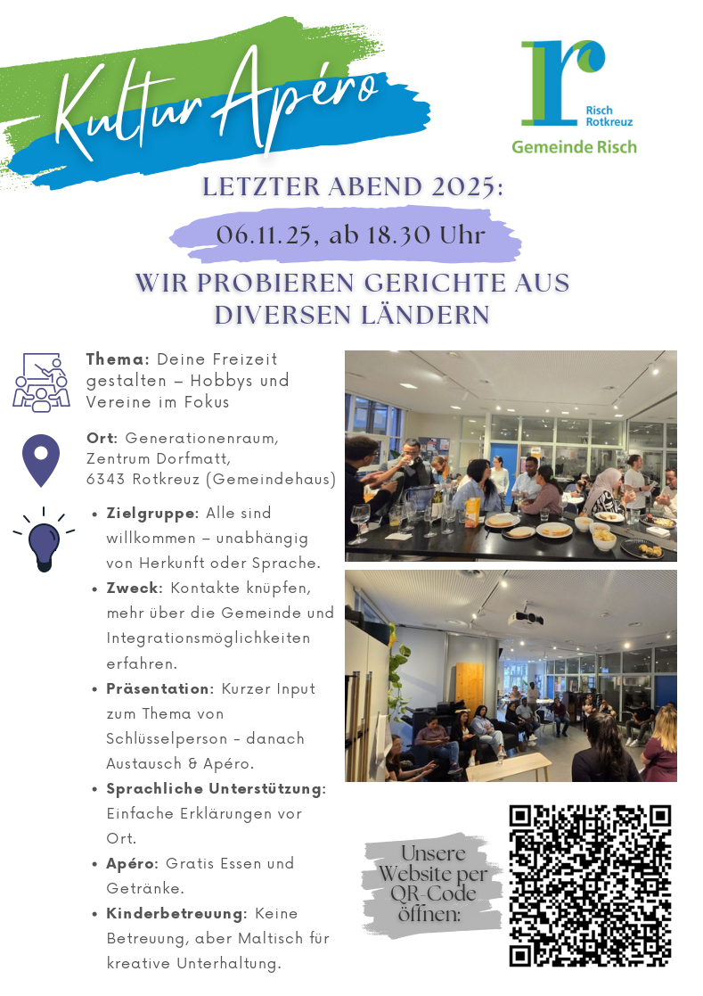 Der Kulturapéro ist ein Begegnungsformat der Gemeinde Risch, das vom Netzwerk Schlüsselpersonen organisiert und geleitet wird. Ziel ist es, die Integration zu fördern und den Austausch zwischen Menschen unterschiedlicher Kulturen zu ermöglichen.