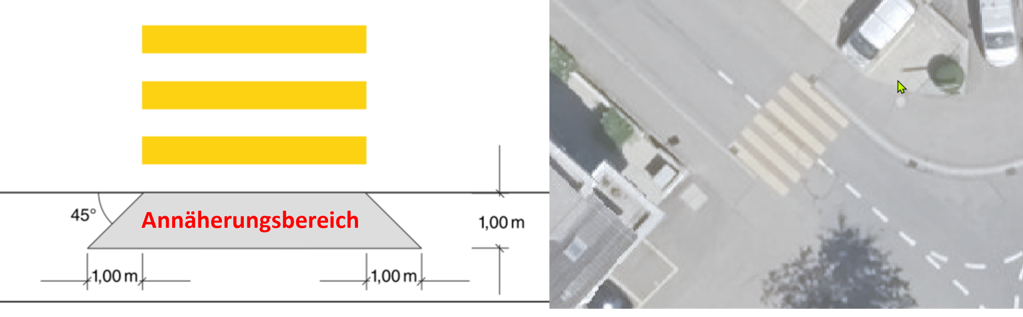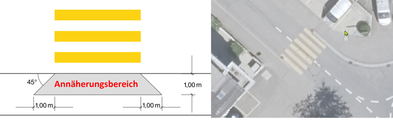 Die VSS-Norm schreibt vor (Ziffer 8), dass der Annäherungsbereich jeweils einen Meter vor dem Fussgängerstreifen beginnt und in einem Winkel von 45 Grad freigehalten werden muss. So können sich alle Verkehrsteilnehmenden frühzeitig erkennen. Dies ist ein wichtiger Beitrag zur Sicherheit.