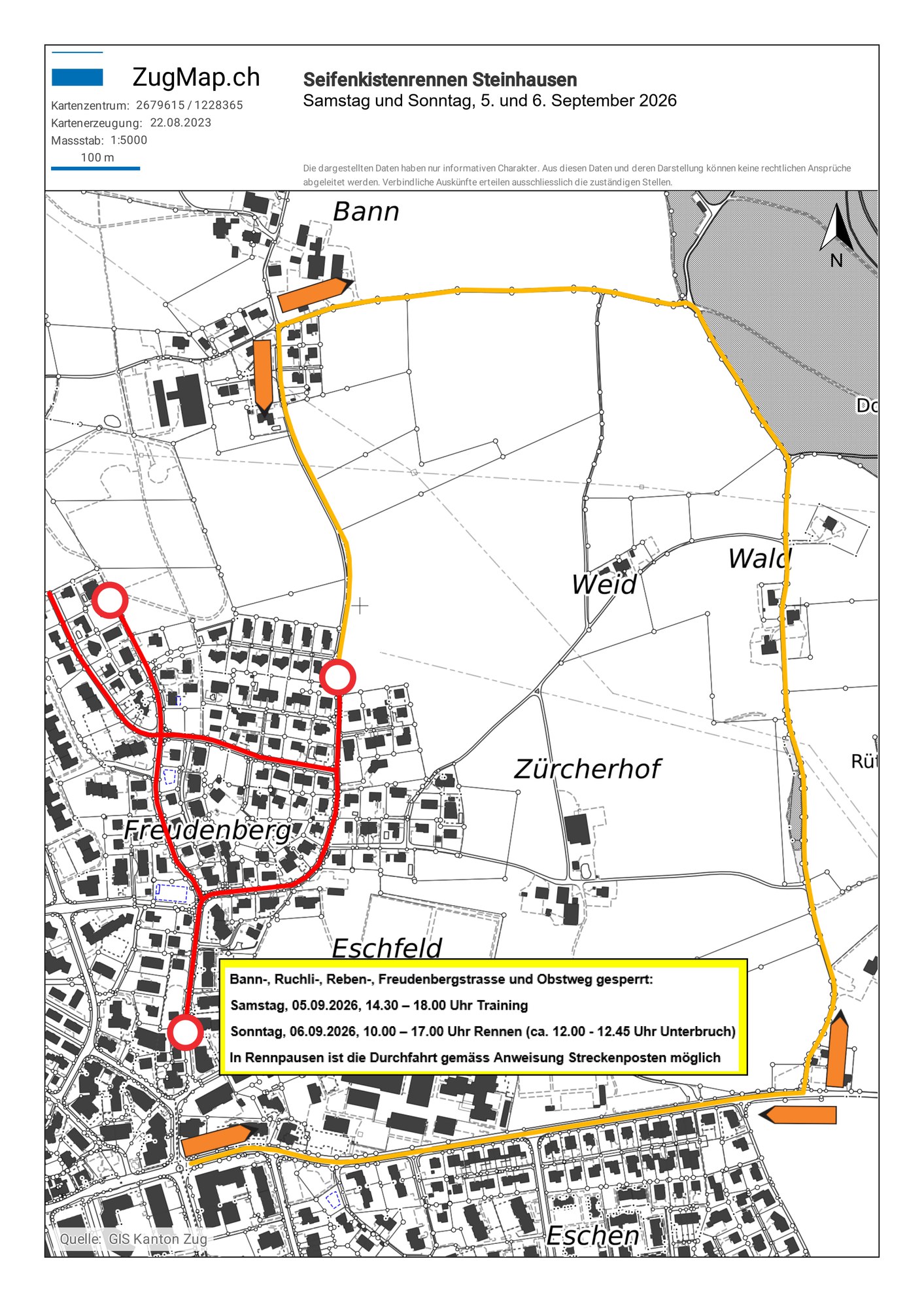 Anlässlich des Grand Prix Freudenberg, organisiert von der Jungwacht Steinhausen, wird die Bannstrasse, ab Höhe Rest. Szenario bis zum Obstweg, am Samstag, 5. September 2026, von 14.30 bis 18.00 Uhr und am Sonntag, 6. September 2026, von 10.00 bis 17.00 Uhr gesperrt. Davon betroffen sind auch die Ruchlistrasse, Rebenstrasse, Freudenbergstrasse und der Obstweg. Das Bann, die Zürcherhof- und Weidstrasse sowie der Chriesiweg sind jederzeit über die Tann- und Waldstrasse zu erreichen.