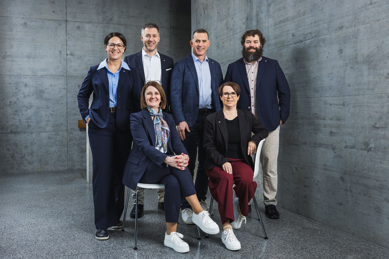 Der Gemeinderat mit Gemeindeschreiberin seit dem 23. Dezember 2025 (von links oben): Cécile Banz (Gemeindeschreiberin), Andreas Hürlimann (Vizepräsident), Markus Amhof (Gemeindepräsident), Gregor Imholz, (sitzend von links) Esther Rüttimann, Andrea Keller-Cathry.