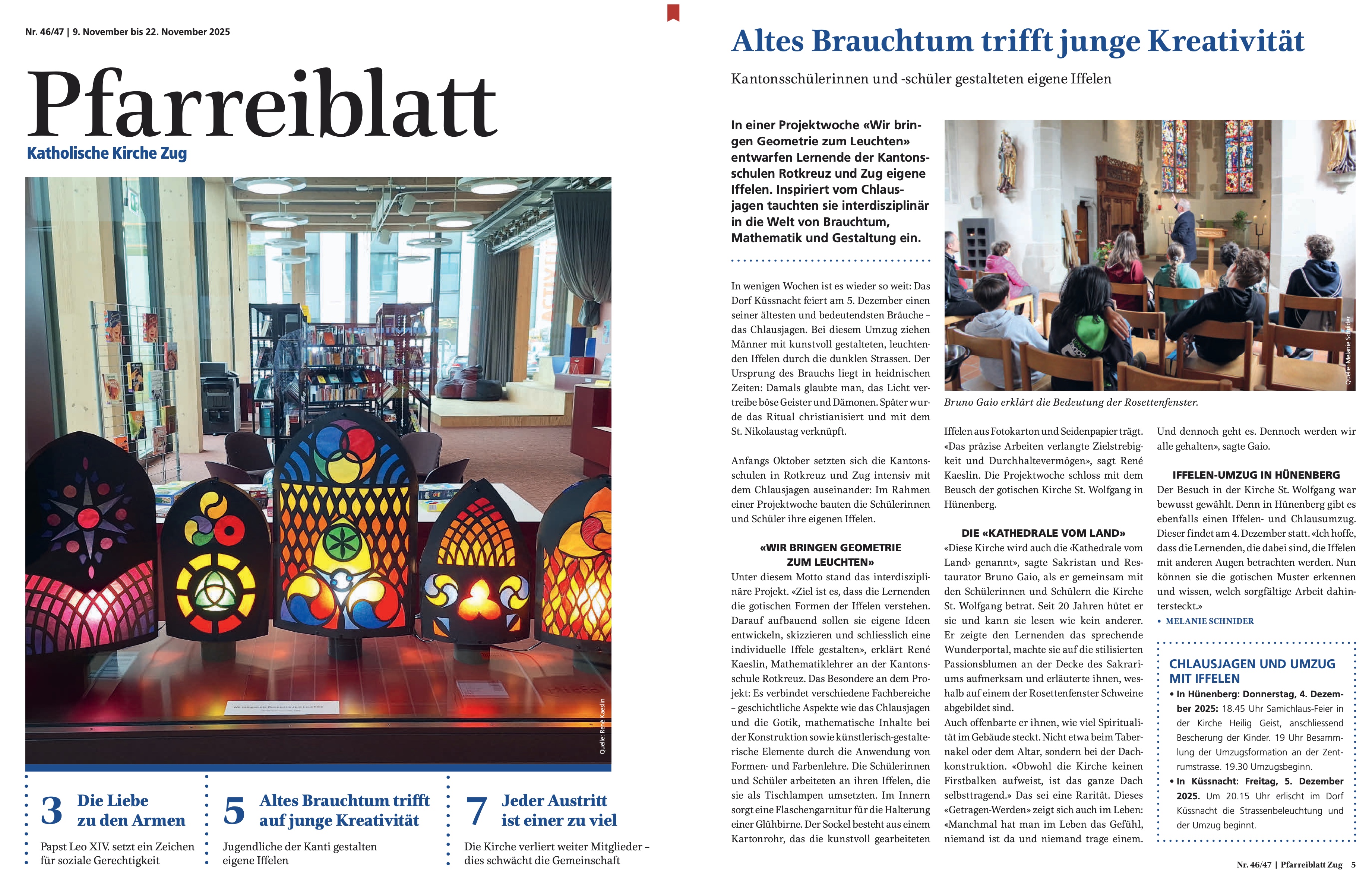 In einer Projektwoche «Wir bringen Geometrie zum Leuchten» entwarfen Lernende der Kantonsschulen Rotkreuz und Zug eigene Iffelen. Inspiriert vom Chlausjagen tauchten sie interdisziplinär in die Welt von Brauchtum, Mathematik und Gestaltung ein. Artikel im Zuger Pfarreiblatt 46/47.