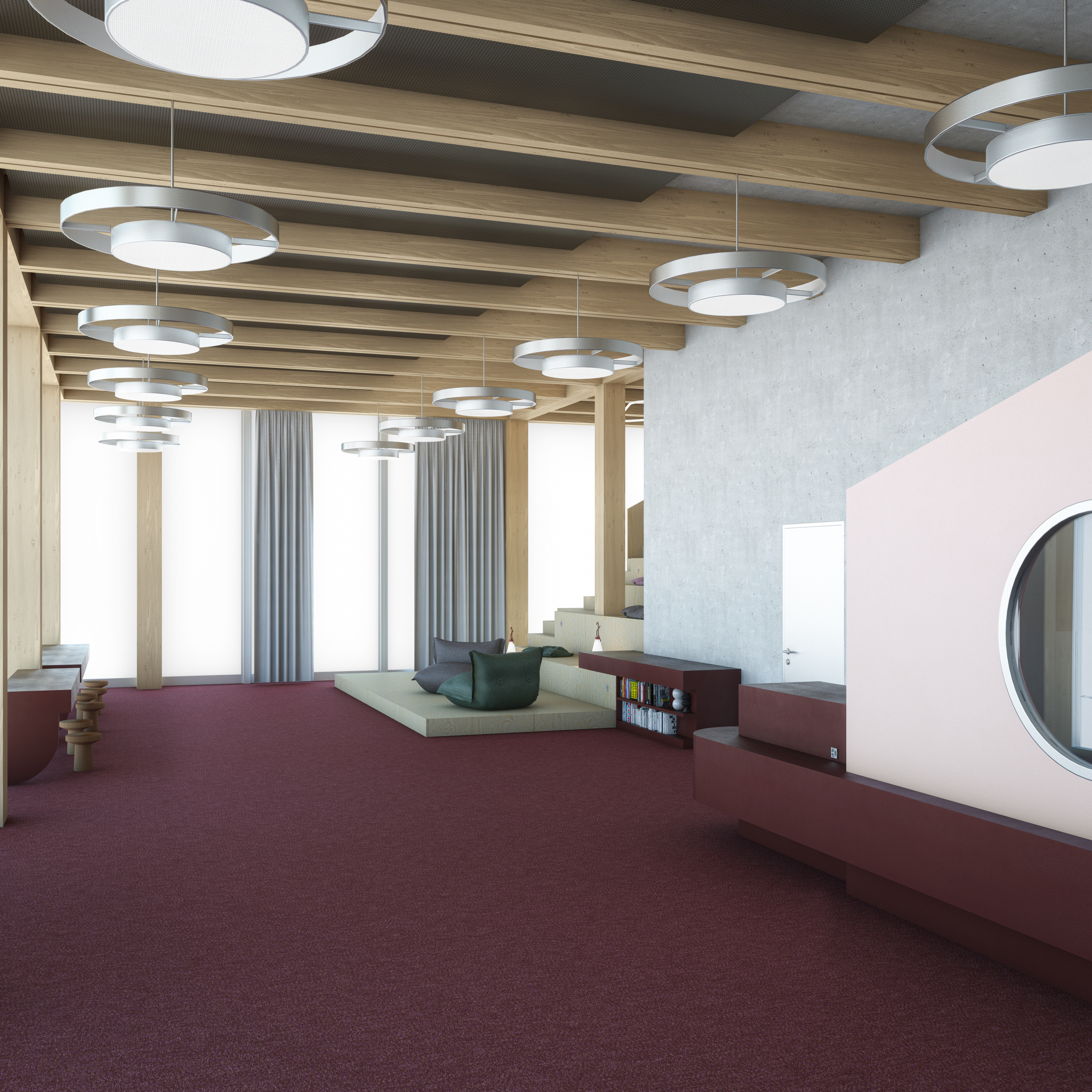 Die Mediothek der KS Rotkreuz ist direkt beim Eingang im Erdgeschoss. Sie enthält eine Ausleihtheke, Bücherregale, eine kleine Lounge, einige Arbeitsplätze am Fenster und eine Sitztreppe mit einer kleinen Bühne davor.